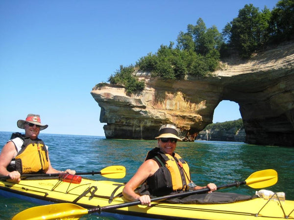 This is our half day or (3) hour paddling trip at the Pictured Rocks with regards to time but still offers some beautiful views of the color stained cliffs, sea caves, and rock formations. We also have the flexibility to accommodate paddlers in the morning or afternoon. 9:00am or 12:00pm, 3:00pm and 6:00pm meet times at our shop. Since we are not traveling as many miles on this trip as others, we like to paddle at a slower pace. This is usually agreeable with most folks that choose this trip over our longer paddling excursions. The trip covers the shoreline from Miners Beach to Shipwreck Point. Departing from Miners Beach you’ll see the Miners Castle and sea caves at the base of this rock outcropping and then as we paddle north east towards Shipwreck Point the magnificent coloring of rocks being stained by eons of water and mineral seepage down the face of the 200 foot cliffs. Tandem Double Kayaks. Minimum age 6.